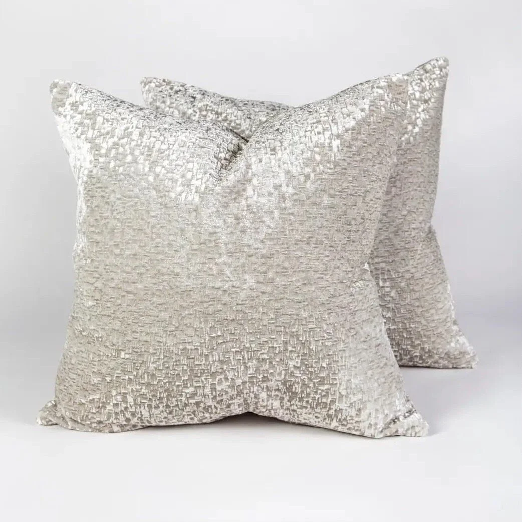 Immerse yourself in the captivating beauty of this eye-catching pair of custom 22" x 22" velvet pillow covers made from to-the-trade fabric by Romo. The pattern is called 'Stepping Styones'. The tactile texture hues created by the cut velvet creates a luxurious look. With this intricate pattern that is embellished by the varying hues of white created by light at different angles, these pillow covers exude an air of elegance and sophistication while being soft and cozy to the touch.
